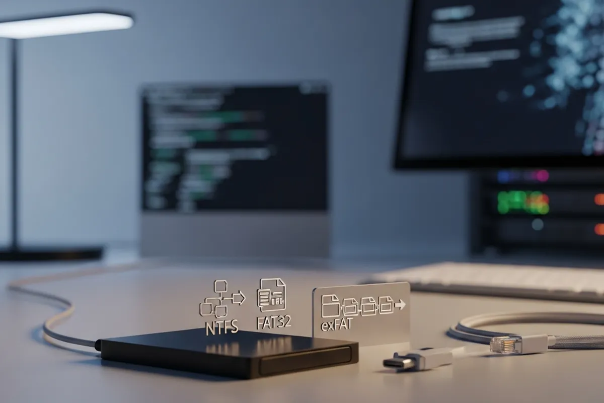 Disco duro externo con iconos de sistemas de archivos NTFS, FAT32 y exFAT en un entorno de trabajo digital.